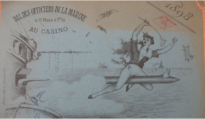Carton d’invitation au bal des officiers de la Marine de 1883, scène représentant une femme à califourchon sur un missile tiré, d’où